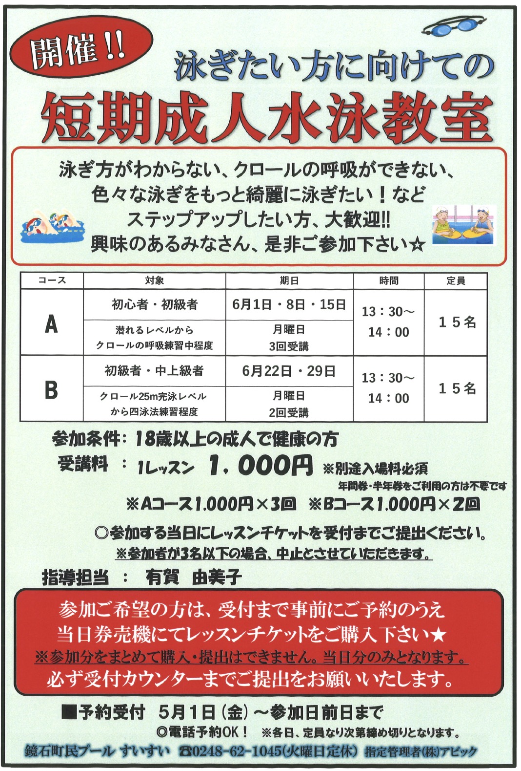 短期成人水泳教室募集のお知らせ | 鏡石町民プール すいすい